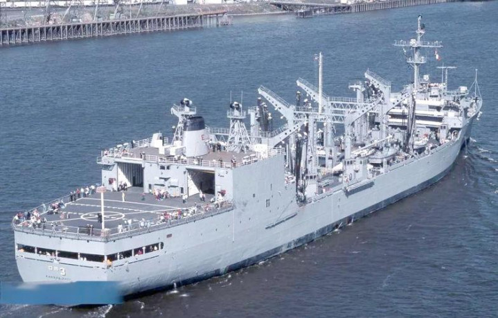 咱们来看看这艘船的数据:舰长241米,宽32米,满载排水量接近5万吨! 这是什么概念?这基本上就是一座移动的海上物资库。它能装载海量的燃料、武器弹药和各种补给物资。