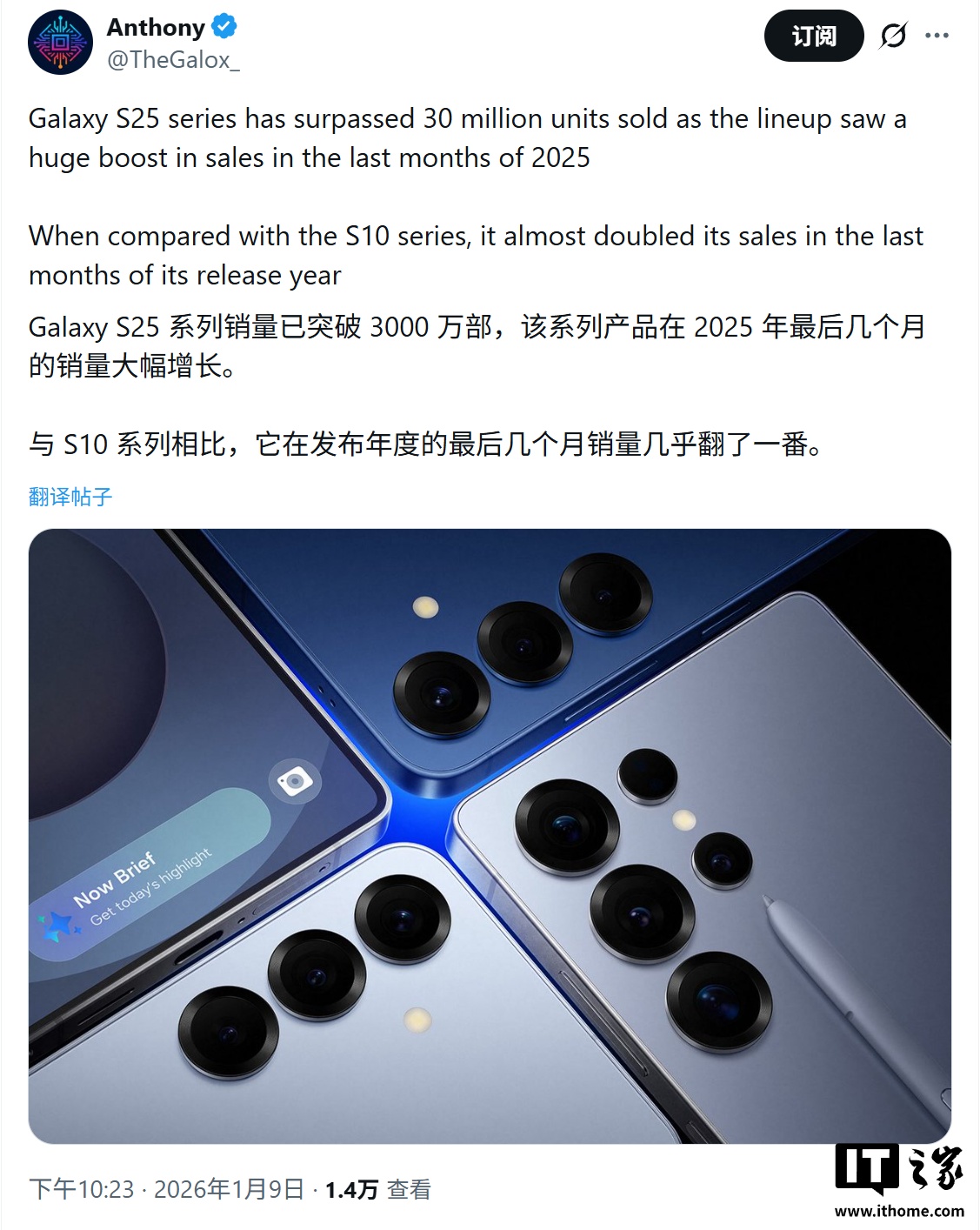 IT之家 1 月 10 日消息,消息源 @UniverseIce 昨日(1 月 9 日)在 X 平台发布推文,报道称基于 CounterPoint Research 机构数据,三星 Galaxy S25 系列手机在发布 8~9 个月后迎来“第二春”中金策略,总销量已突破 3000 万台。
